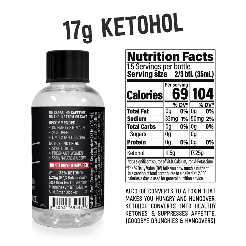 Hard Ketones ofrece una sensación única sin necesidad de alcohol, THC, kratom, kava ni elixires herbales. Su ingrediente exclusivo, el Ketohol (R 1,3-butanodiol), está patentado. Originalmente investigado para uso terapéutico debido a su capacidad para aumentar los niveles de cetonas en sangre, fue descartado porque: