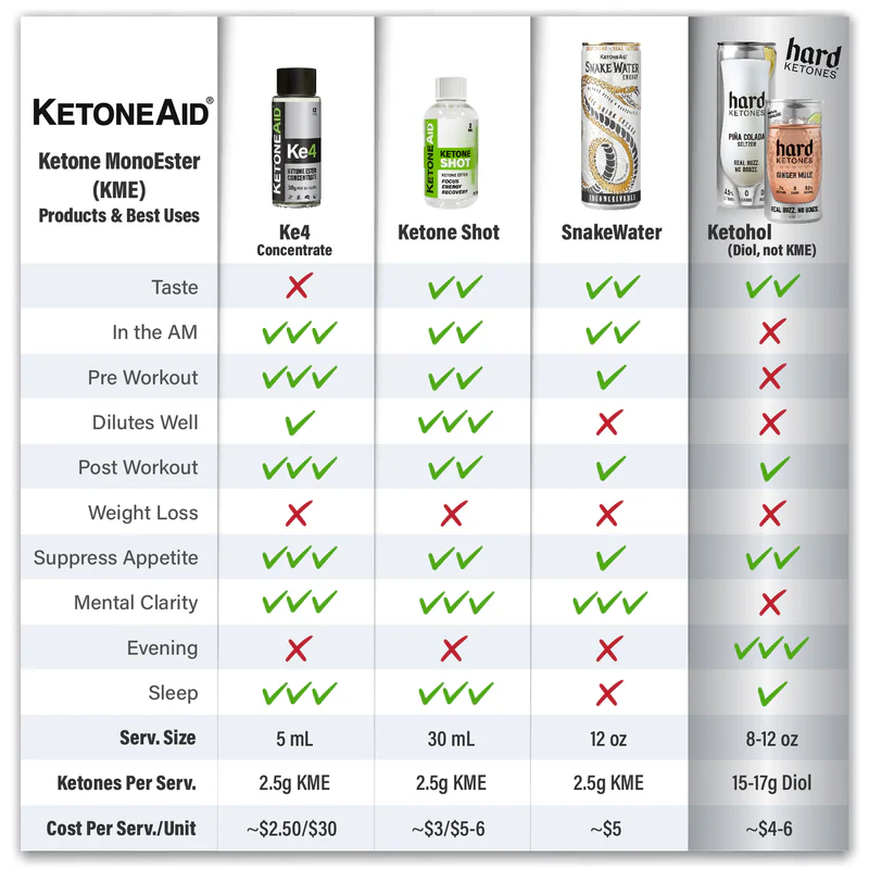Ke4 Concentrado sigue siendo la opción más rentable por gramo efectivo de cetonas exógenas en comparación con sales, dioles u otros “ésteres”.